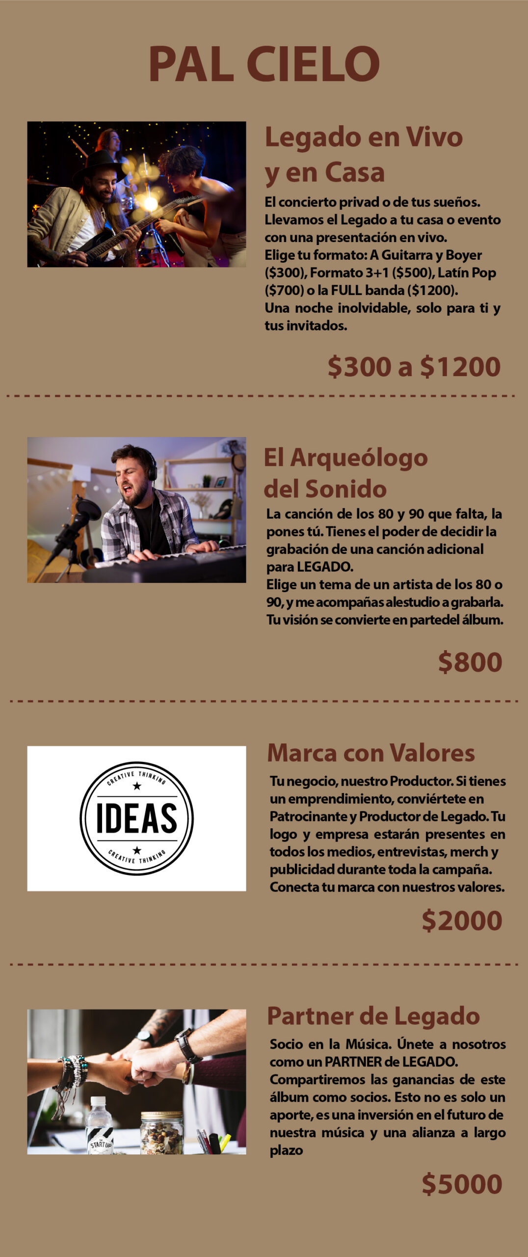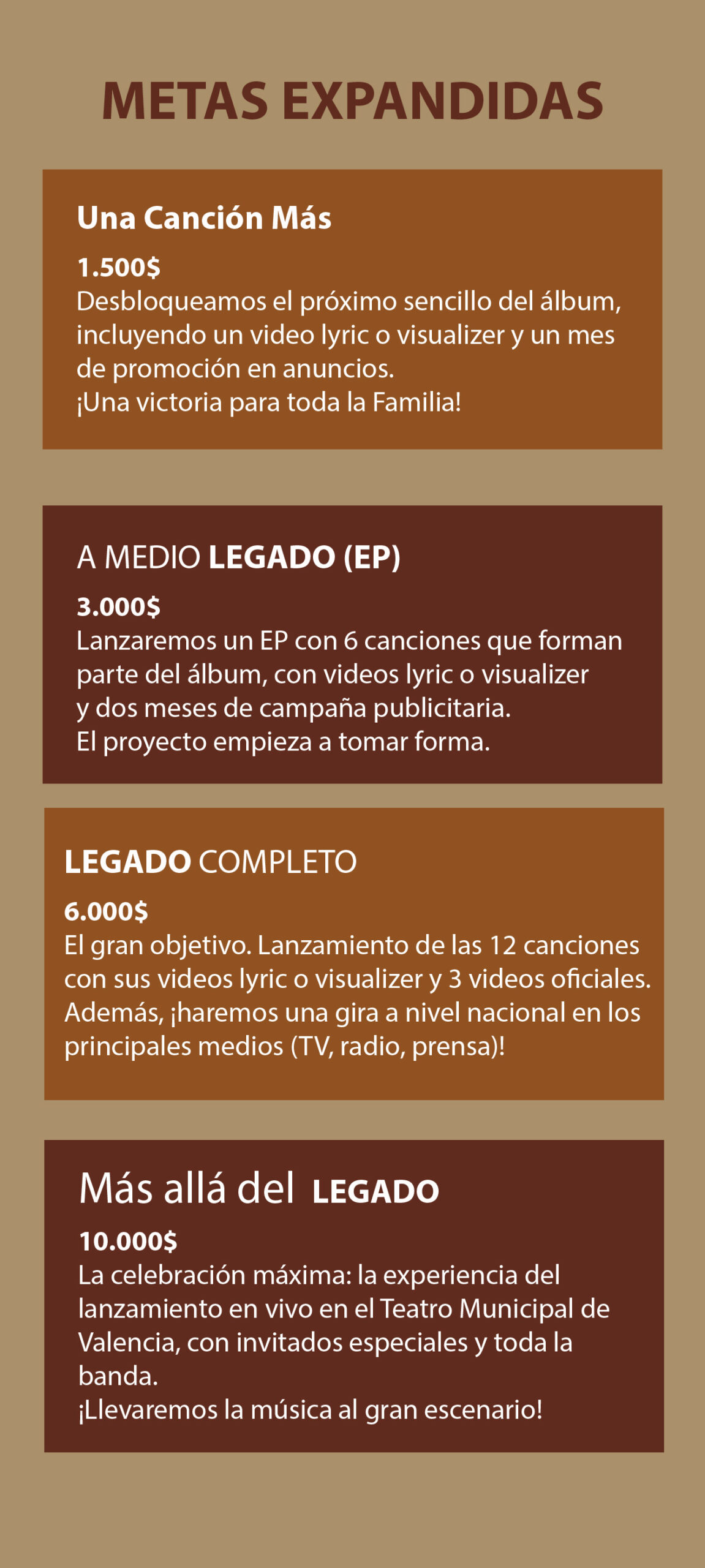 Las metas expandidas son objetivos extra que se activan cuando superamos la meta principal. Si la campaña recauda más, podemos hacer cosas adicionales como grabar más canciones, mejorar la producción o crear nuevos contenidos. Mientras más apoyo reciba LEGADO, ¡más lejos llega el proyecto!